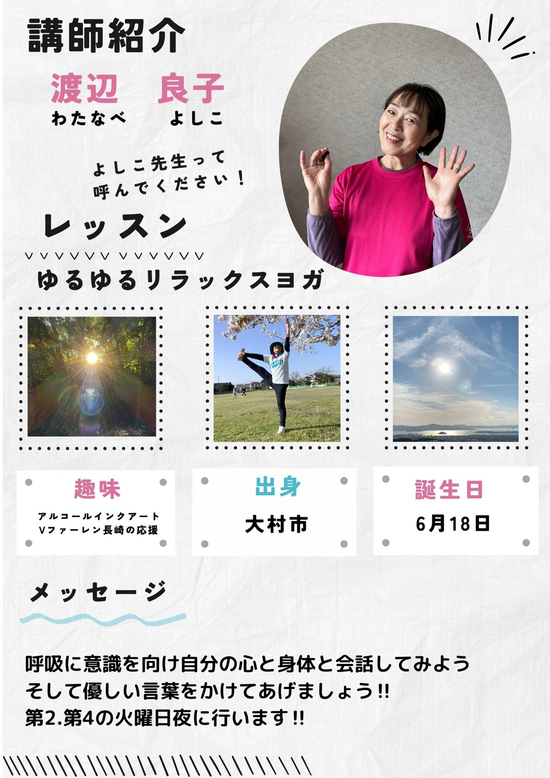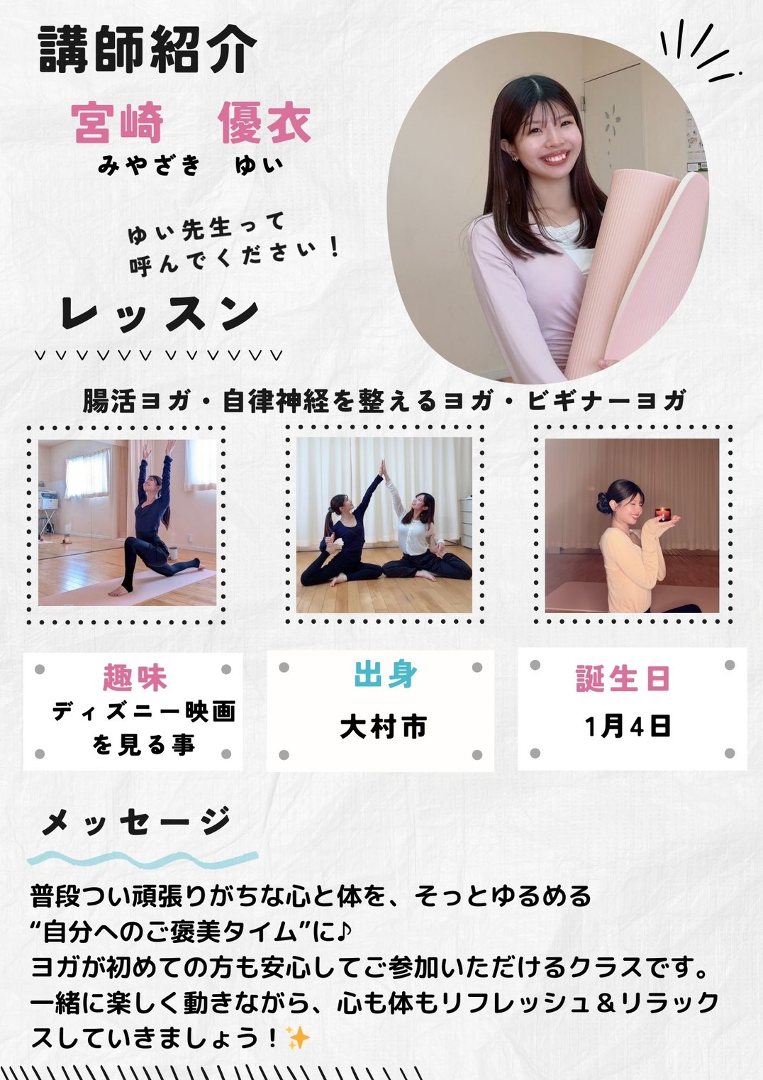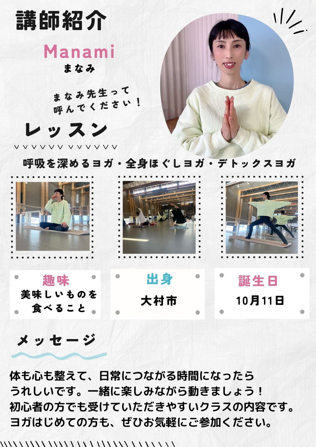 ベーシックヨガ、椅子ヨガ、リラックスヨガ、美ママコースなどいろいろなコースがあります。心と体、魂を調和させバランスを整えるためのエクササイズです。