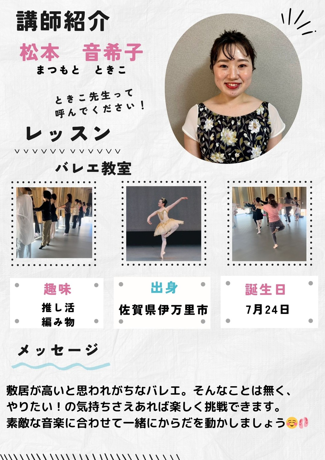 クラシックバレエを基本に、大人でも無理せず続けられるバレエ教室です。体験後は、バレエシューズの購入は必須ですが、服装は自由です。動きやすい服装でご参加ください!ステップしたり、回ったり、健康や姿勢改善のためにはじめるのも◎
