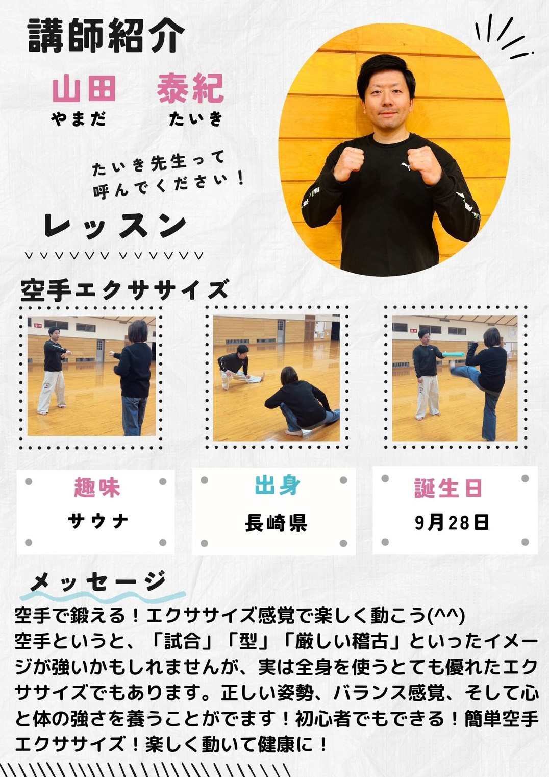 無理なく、けがの内容に正しいフォームでのトレーニングが可能です。筋肉つきすぎることはなく、程よく使っていない日ごろ運動不足の筋肉を呼び覚ましましょう。最後にはリフレッシュにもなる空手エクササイズも人気です。