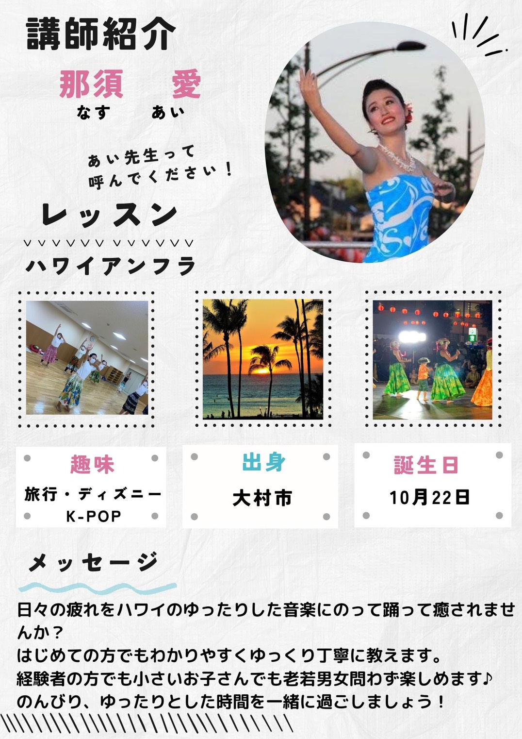 ハワイアンミュージックに合わせて、優雅な手の動きやなめらかな体の動きで、心も体も癒し、シェイプアップにもつながります。