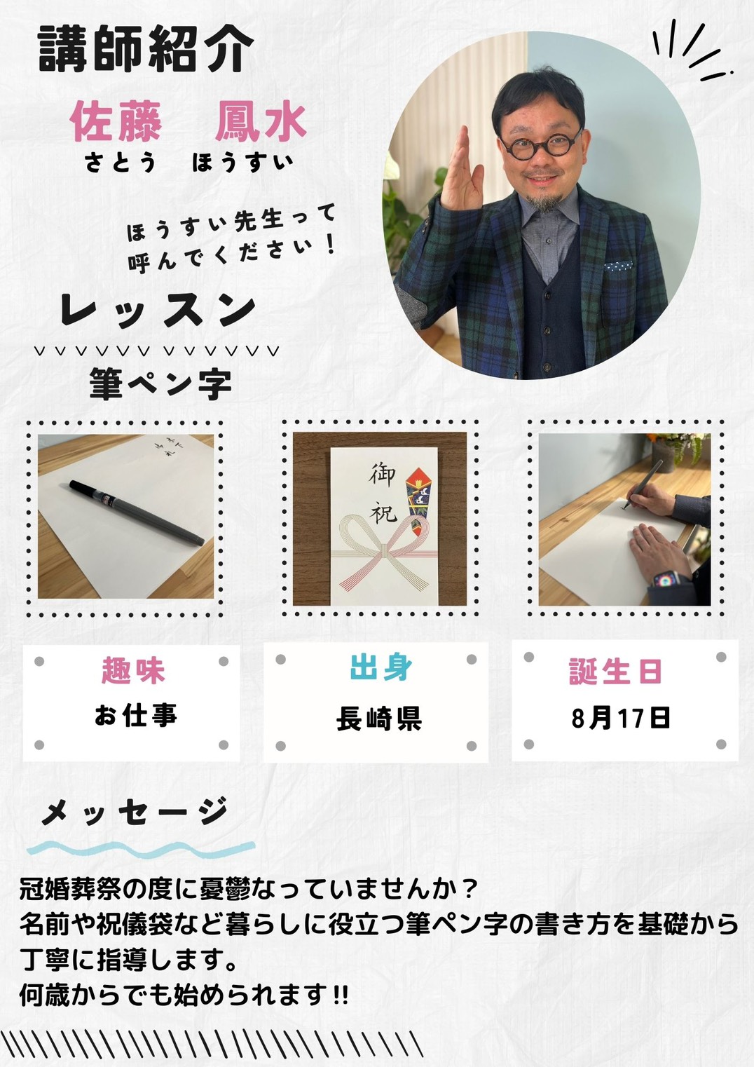 筆ペンを使い自分の書きたい文字をコツコツと学べる。日々の暮らしに活用できる筆ペン字のクラスです。